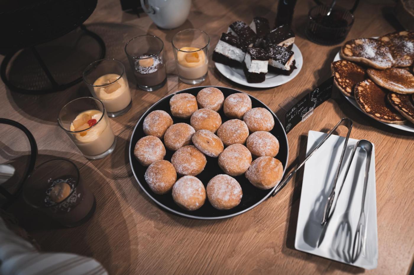 A continental buffet breakfast is served with warm dishes, fresh pastries, cheese, fruits, and juice. Guests appreciate the variety and quality of the morning meal.
